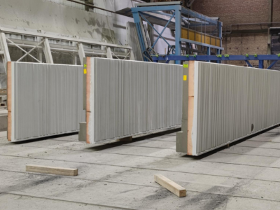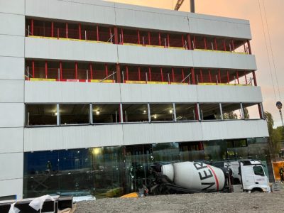 This building also has decorative precast concrete facade pieces installed on the construction site.