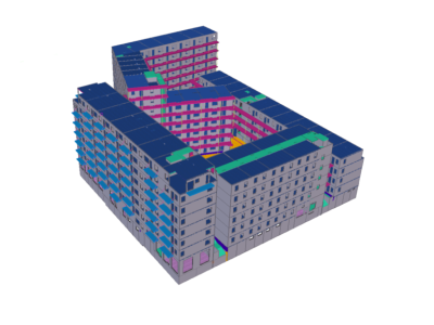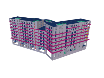 Lots of different shops are intended to be located on the lower floors, whereas the upper floors will contain 228 privately-owned apartments and apartments for rent facing the main road, as well as 238 student apartments facing smaller streets. A new home will be provided for a total of 1300 people. The object is divided into two parts – East and West. The western part is built from 19 380m2 of HCS, 1 140m2 of solid slabs and 21 840m2 of prefabricated reinforced concrete walls. The eastern section is built from 15 300m2 of HCS, 1 570m2 of solid slabs and 20 600m2 of prefabricated reinforced concrete walls. The work on this project was interesting because of the requirement not to reduce the number of parking spaces in the basement, thus creating a complex structural scheme.