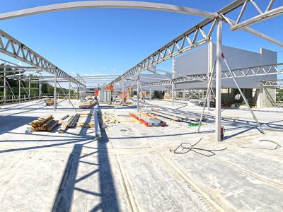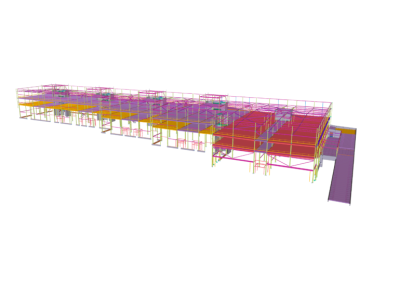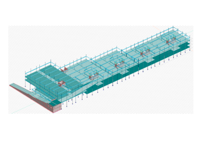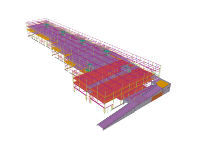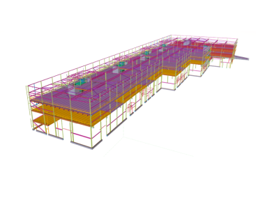 The building’s geometry is longitudinal. It is divided into three different buildings with a moving connection, which presented an interesting challenge in regard to ensuring stability so that major pulling forces did not arise.