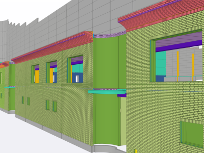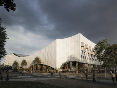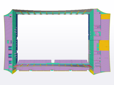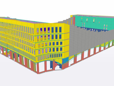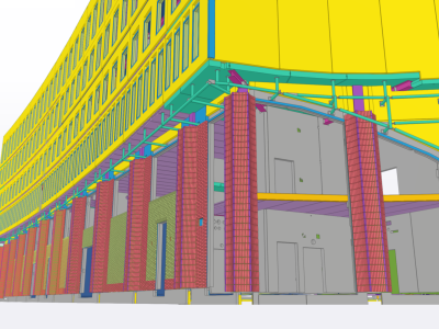 From a structural design perspective, the most challenging components are the pre-cambered trusses above the basketball hall, the concrete façades supported by cantilevered floor slabs, and the exceptionally tall arena columns—approximately 24 m in height, comparable to a nine-storey building, and constructed in a single continuous concrete pour.