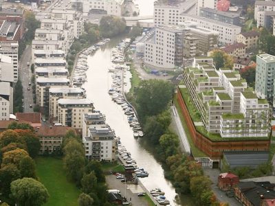 Industrial estate (former printing house building) on the bank of Bällstaån canal, which serves as the foundation for a complex of 270 apartment buildings above it. The building also provides premises for public needs and business development, and also accommodates a preschool educational institution, which is divided into three parts with a total yard area of 820 m2.
